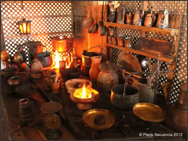 - Iluminación: Lámparas de araña, candelabros de pie, quinqués, faroles, linternas, candiles, antorchas, palmatorias y velas.