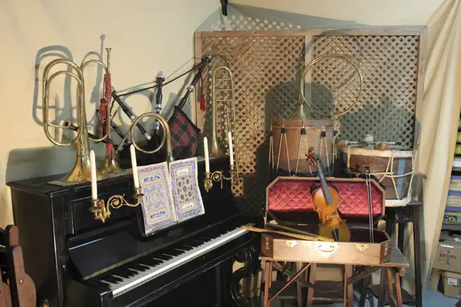 Piano vertical negro con candelabros encendidos, violín en estuche, trompetas, gaita escocesa y tambores sobre fondo de rejilla