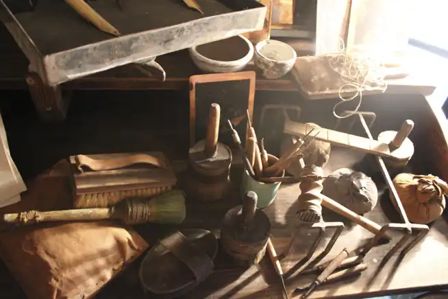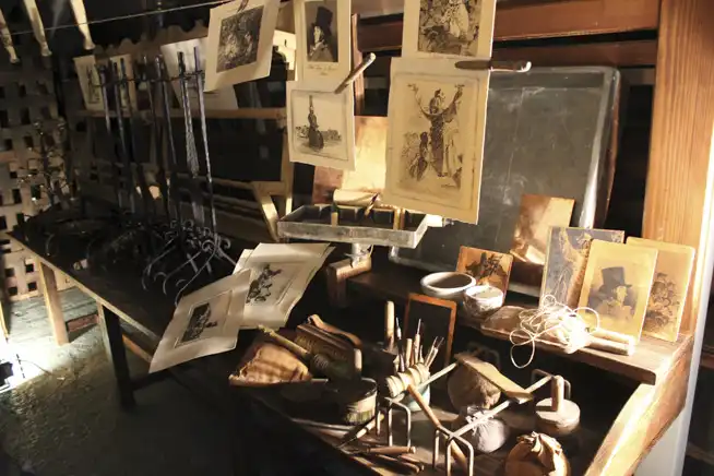 Prensa vertical de madera con manivela, planchas de cobre y dibujos sobre mesa en almacén con taburetes al fondo