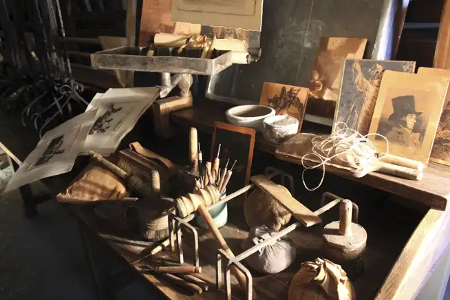 Mesa con rodillos de tinta, dibujos colgados, herramientas de grabado y planchas sobre fondo de rejilla en taller