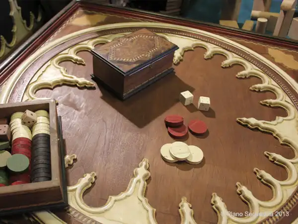 Tablero redondo de madera con incrustaciones, caja de fichas, dados blancos y rojos sobre superficie pulida