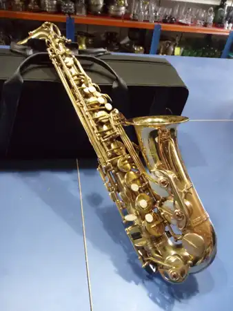 Saxofón alto de latón brillante con estuche acolchado negro sobre mesa azul en almacén con estanterías al fondo