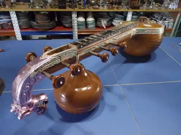 Sitar de madera tallada con cabeza de dragón, resonadores redondos y cuerdas sobre mesa azul en almacén