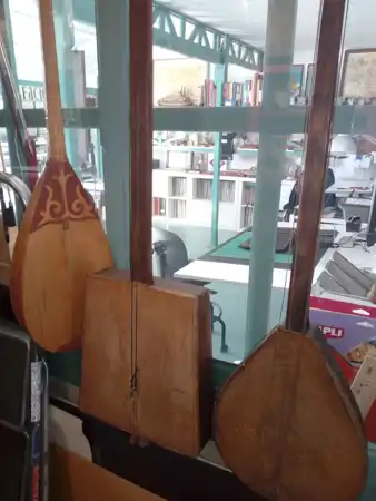 Tres instrumentos de cuerda orientales colgando del techo: laúd, banjo y dombra, frente a estantería con libros