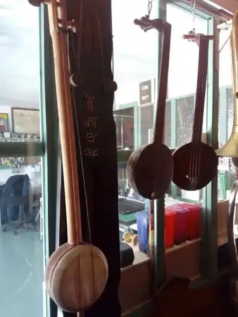 Dos banjos de madera con mástil largo y tambor redondo, uno con inscripciones chinas, colgados junto a ventana