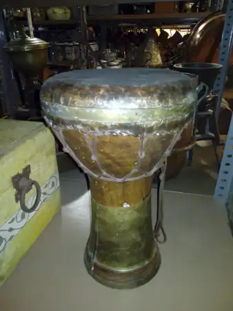 Tambor darbuka de metal dorado y plateado con cuerdas de tensión y parche natural sobre suelo en almacén