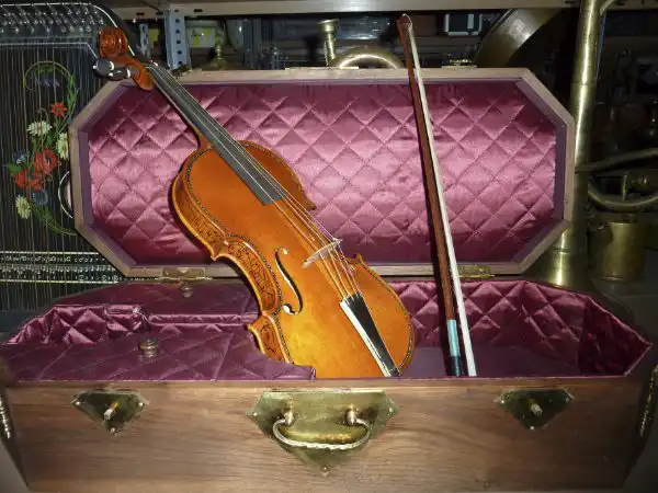 Violín clásico con incrustaciones florales en estuche acolchado rojo, arco apoyado, en almacén con trompetas al fondo