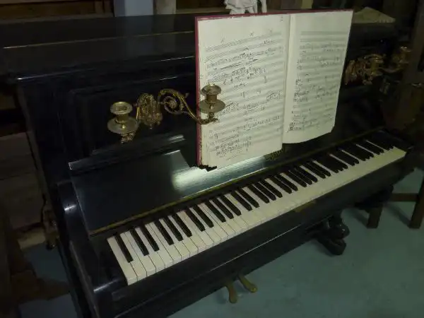 Piano Vertical con Candelabros y Partitura