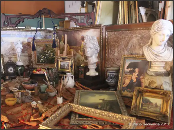 Pila de marcos dorados vacíos, bustos de mármol, cuadros de paisajes y figuras mitológicas; detalle de borla azul colgante y reloj de columna