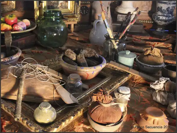 Mesa con pigmentos en boles, saquitos de tela, pinceles, paleta, jarras de cerámica, frutas en bandeja plateada y reloj negro; fondo con cuadros dorados