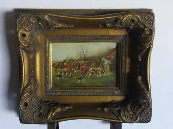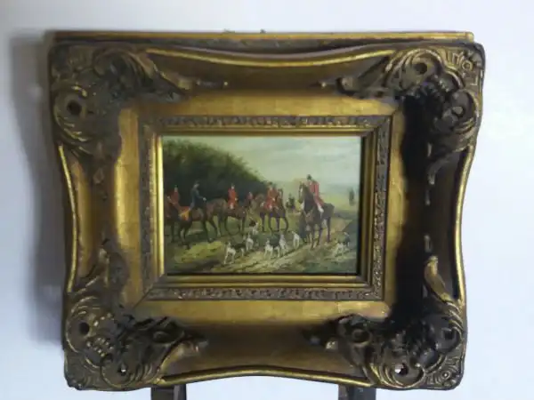 Pequeña pintura de escena de caza campestre con jinetes en chaqueta roja, caballos y sabuesos; marco dorado barroco con esquinas ornamentadas