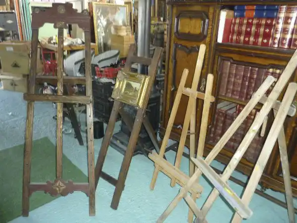 Varios caballetes de madera envejecida, algunos con cuadro pequeño apoyado; fondo con librería y estufa de hierro