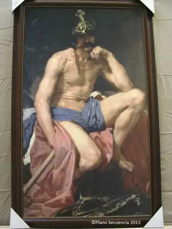 Pintura de guerrero semidesnudo con corona, lanza y drapeadas rojas y azules; estilo academicista siglo XIX