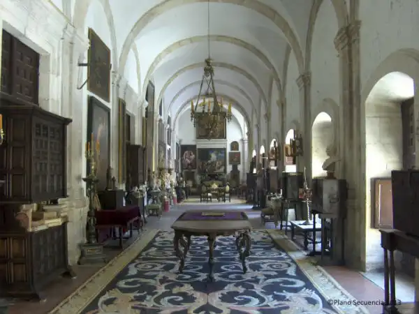 Galería con paredes blancas, cuadros de santos y escenas bíblicas, sillas tapizadas en verde, mesa de mármol, candelabros y arcón tallado; estilo convento o palacio