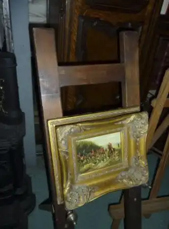 Caballete rústico con pequeño óleo de escena de caza campestre en marco dorado; fondo con muebles antiguos